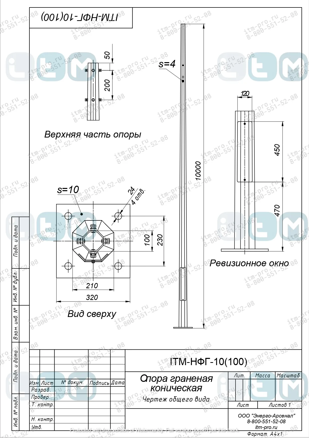 Граненая опора НФГ-10,0(100)-05-ц относится к несиловому типу опор освещения - подвод питающего кабеля возможен только под землей, для обслуживания подключения в опоре  предусмотрен специальный лючок, расположенный в нижней части.